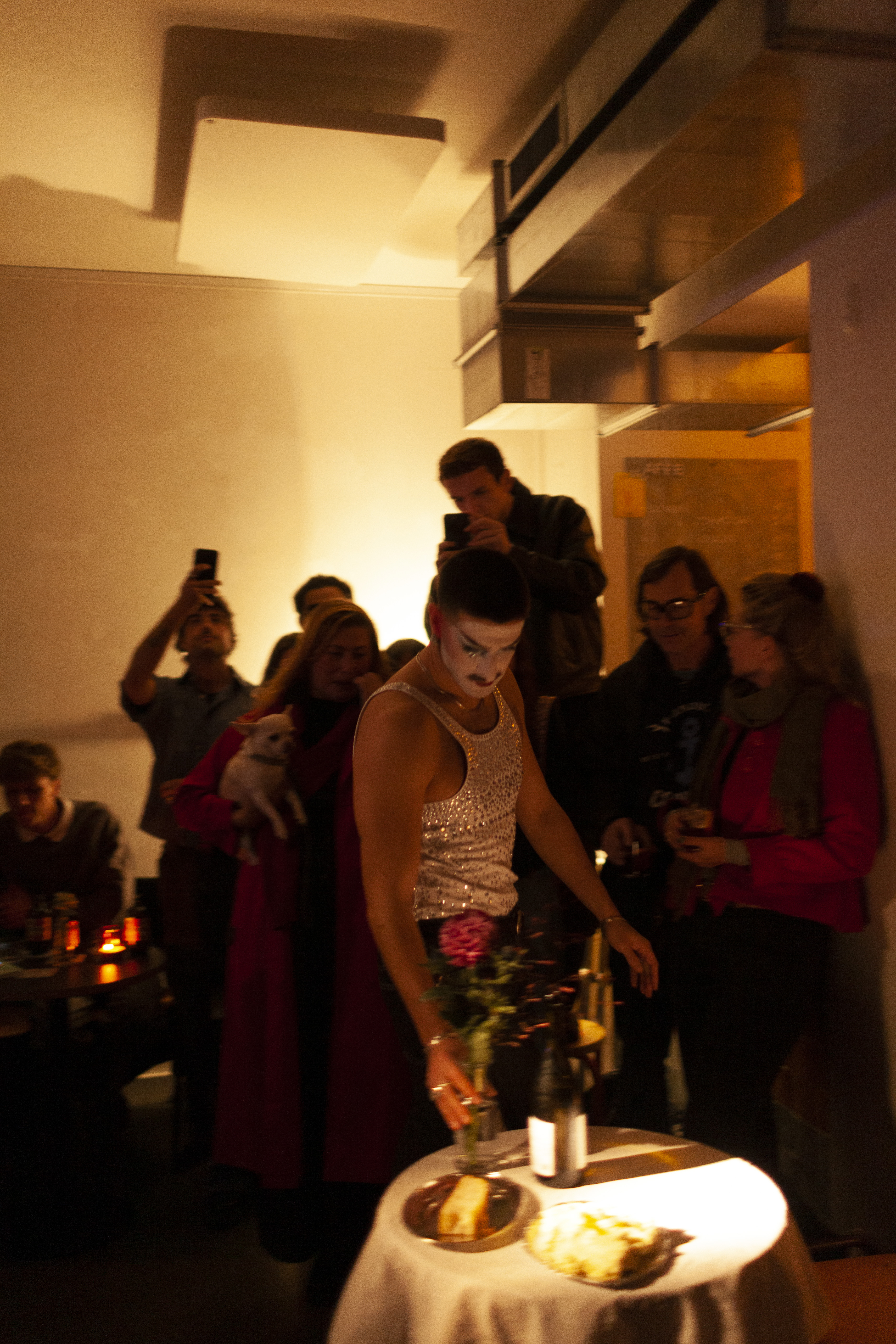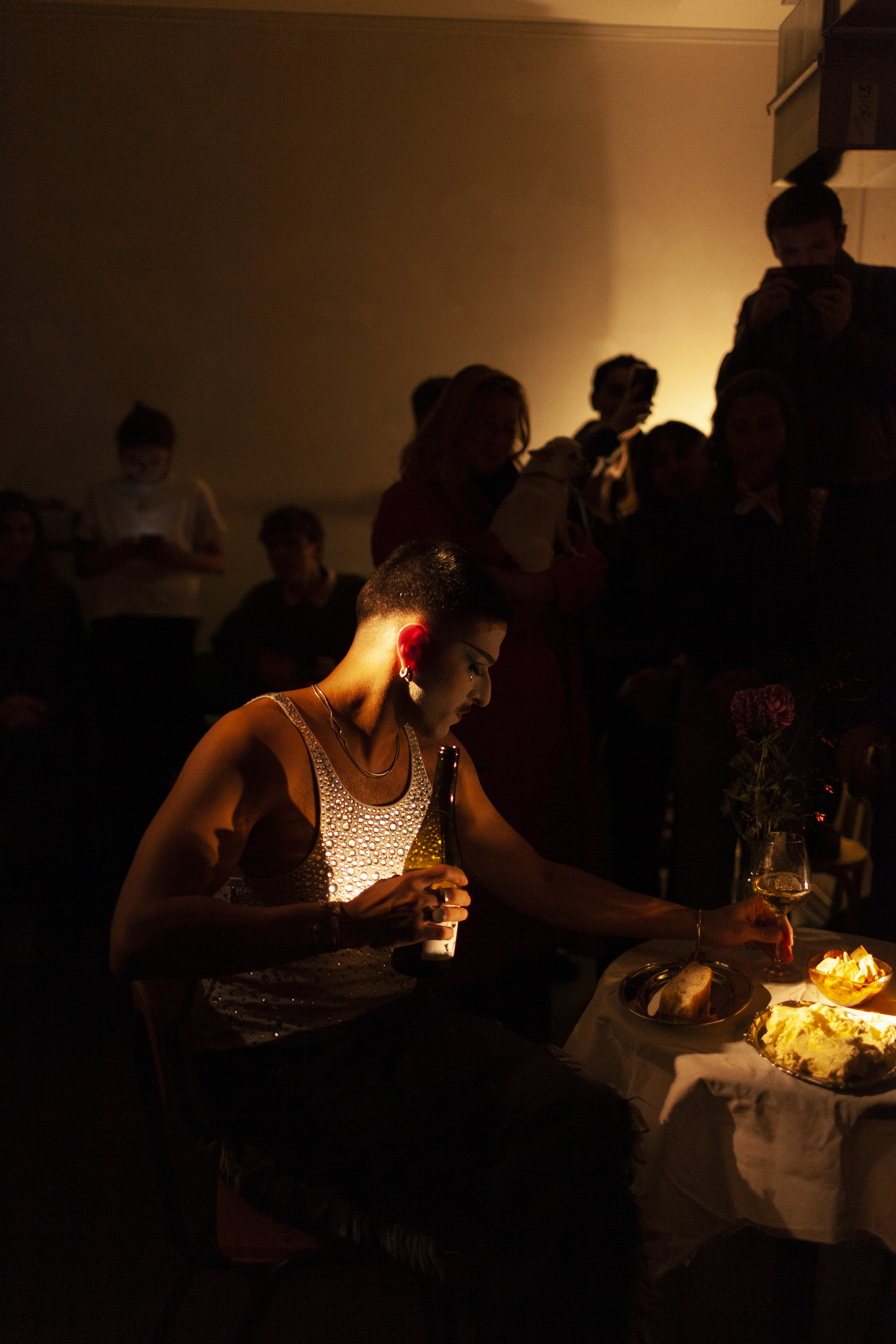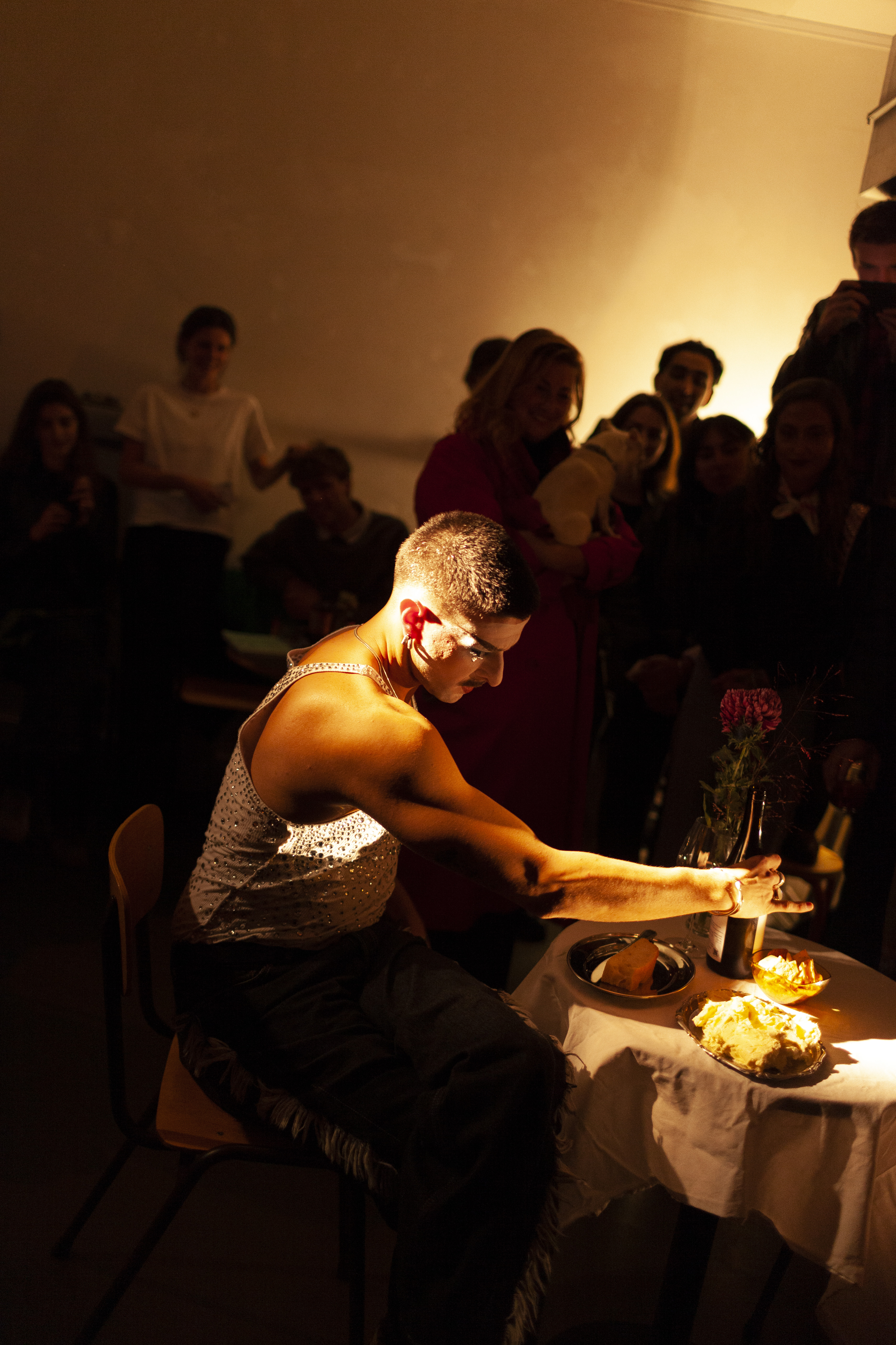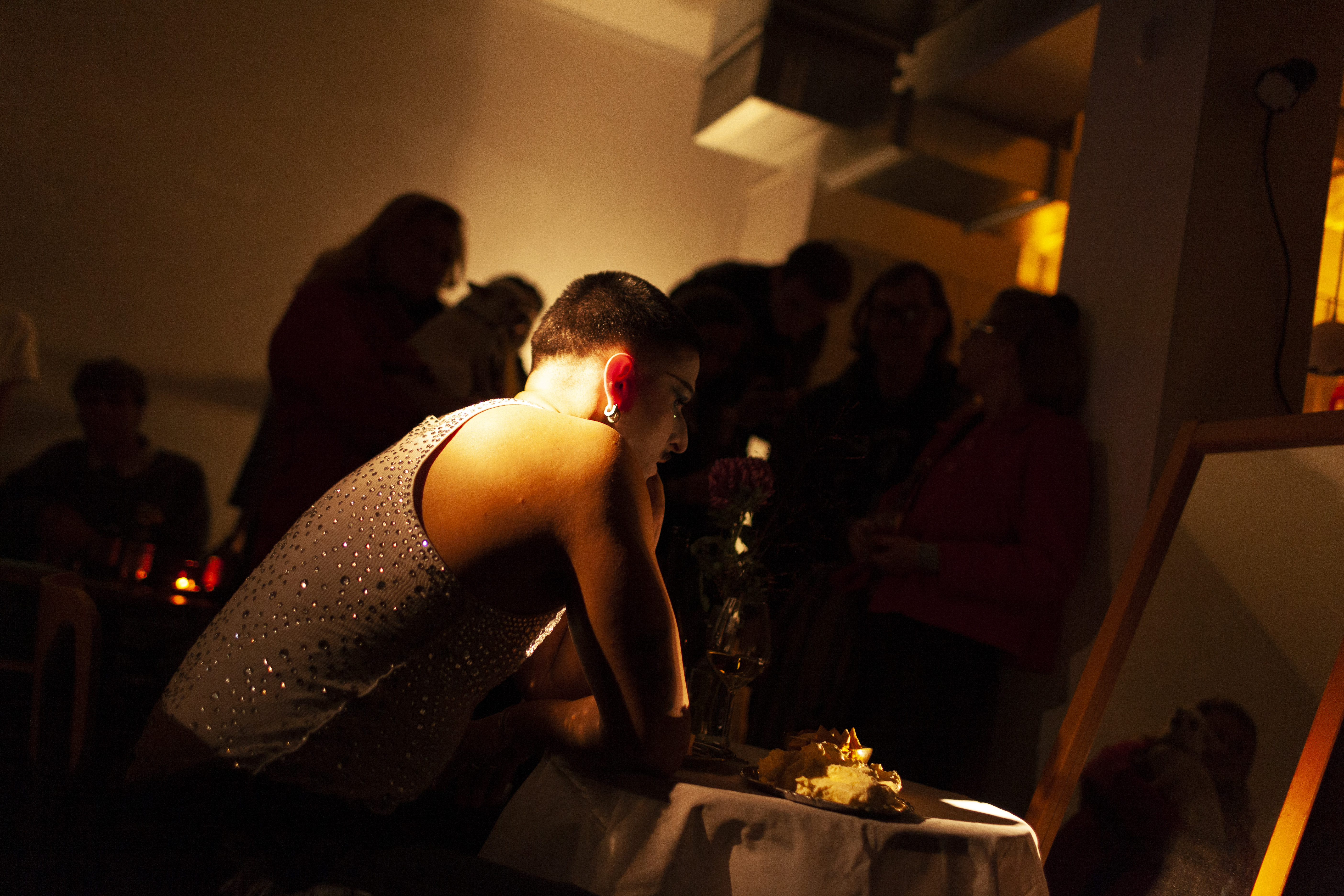 In Sharing the table with someone familiar, Andrea Popovic constructs a quiet yet charged scene of self-encounter. The performance unfolds as a ritual of preparation: a table is set for two, each gesture measured and deliberate, each object placed with the precision of a ceremony. Popovic, dressed in a drag version of a masculine gay man, performs both the anticipation and the labor of intimacy; organizing the space for a meeting that ultimately turns inward. The second guest never arrives; instead, the artist faces their own reflection, seated across the table in a mirror.